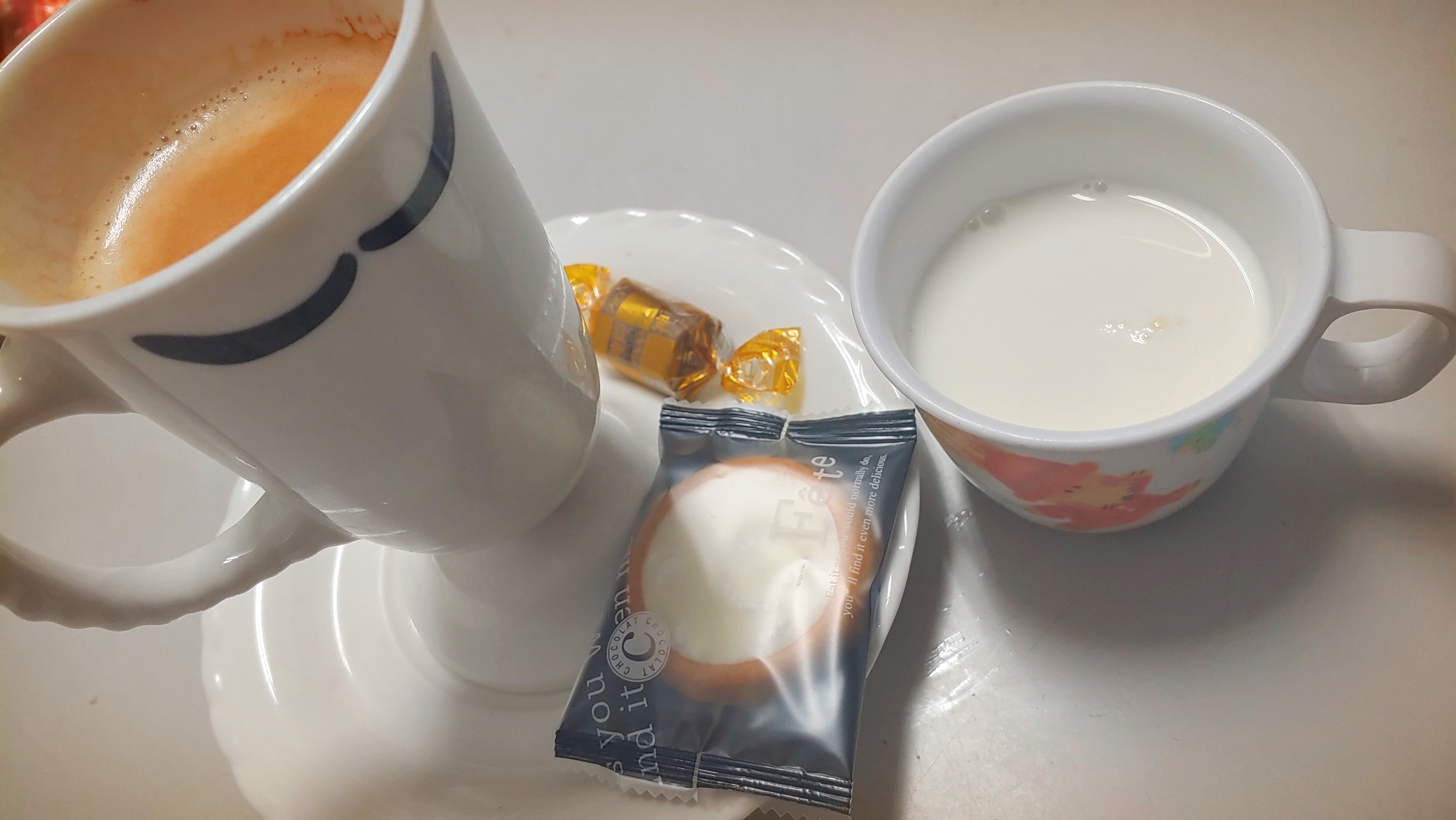 그 다음 후식으로 블랙커피랑 디저트 과자 하나.초쿄렛 하나 유산균 음료 하나 먹었어요! 순서 보니 감 오시죠??? 😘