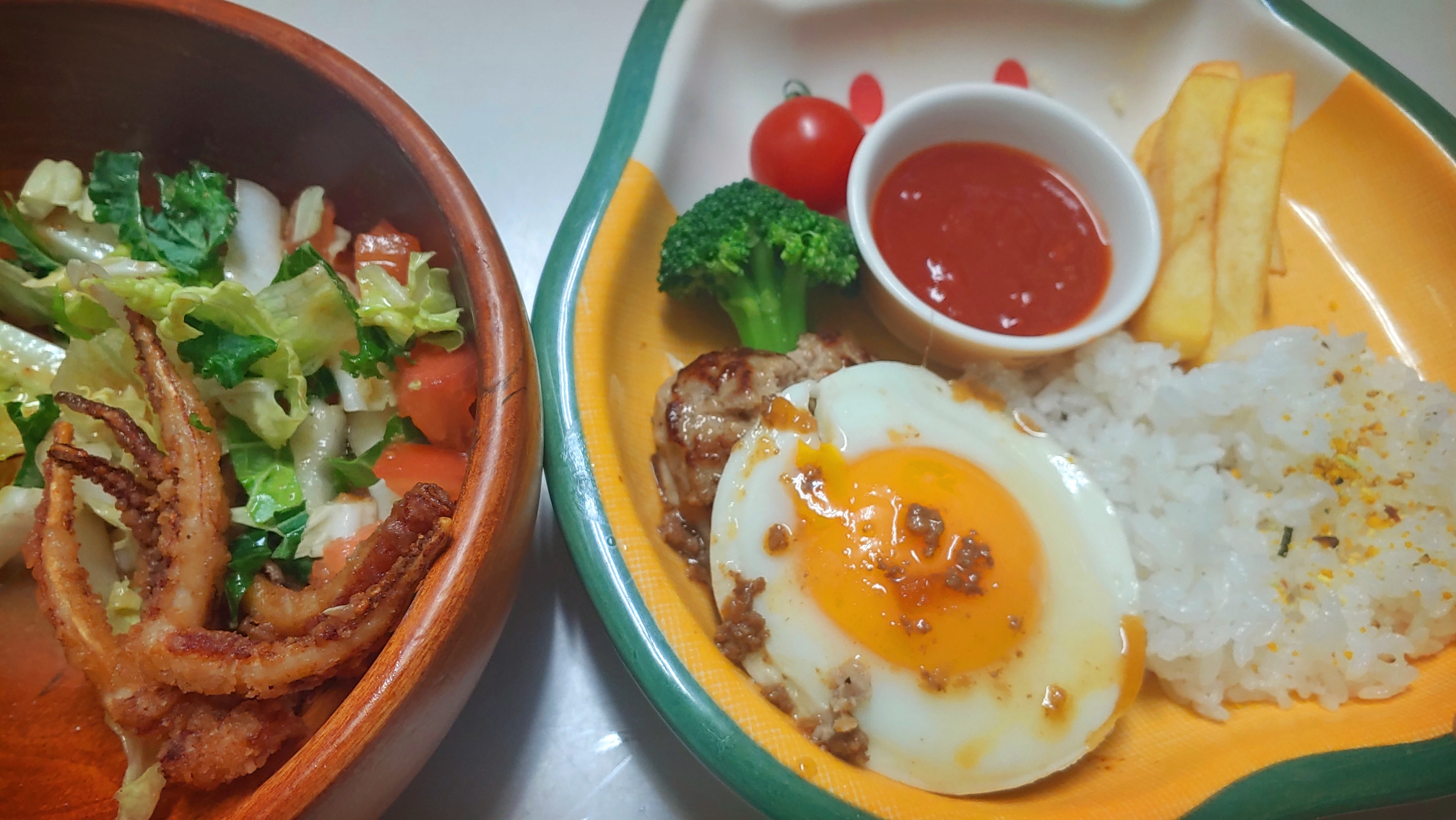 함바그에 계란 추가한거 나와서 일단 고기랑 계란 먹고 아주 조금 남기고 밥 80그램이랑 같이 먹었어요!